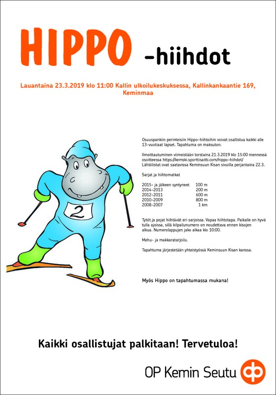 Osuuspankin perinteisiin Hippo-hiihtoihin voivat osallistua kaikki alle 13-vuotiaat lapset. Tapahtuma on maksuton. ILMOITTAUTUMINEN viimeistään torstaina 21.3. klo 15:00 mennessä tästä linkistä. |